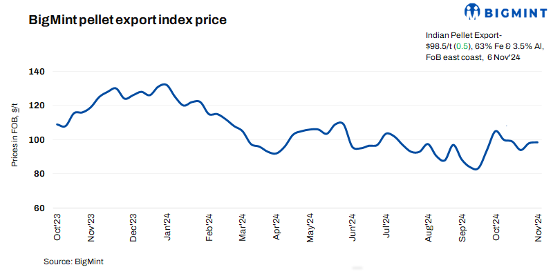 BigMint’s India pellet (Fe 63%, 3% Al) export index (FOB east coast) remained largely stable w-o-w at $98.5/t on 6 November 2024. No export deal was heard concluded so far in this publishing window.