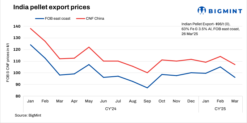 BigMint’s India pellet (Fe 63%, 3% Al) export index (FOB east coast) remained stable w-o-w at $96/t on 26 March 2025 against the previous assessment on 19 March. No trades were recorded this week from the east coast.