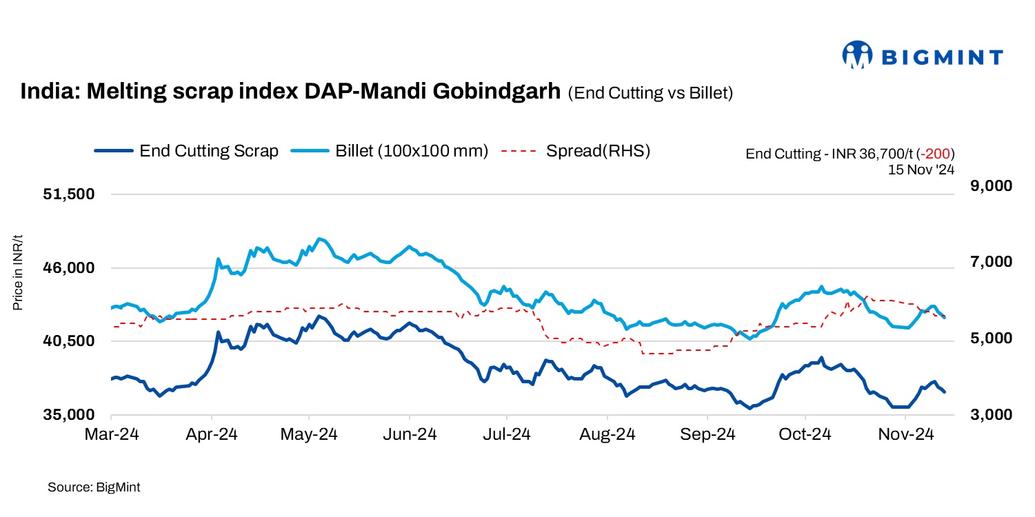 BigMint’s domestic end-cutting scrap index, tracking the Mandi Gobindgarh market, dipped INR 200/t to INR 36,700/t DAP on 15 November 2024.