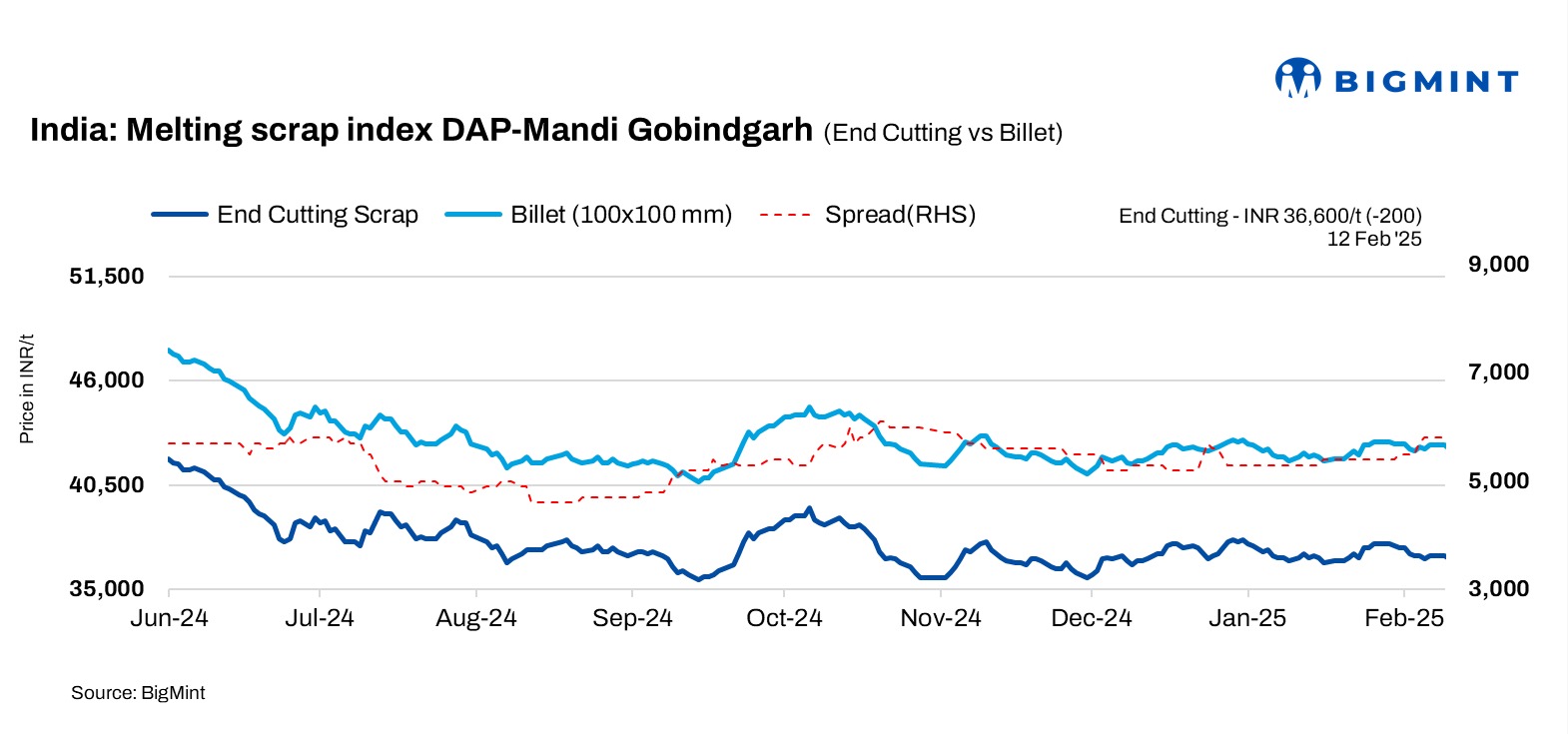 BigMint’s domestic end-cutting scrap index, tracking the Mandi Gobindgarh market, declined slightly by INR 200/tonne (t) d-o-d to INR 36,600/t DAP on 12 February, 2025. Mills are procuring scrap only on need basis, as the steel market is currently in a pause.