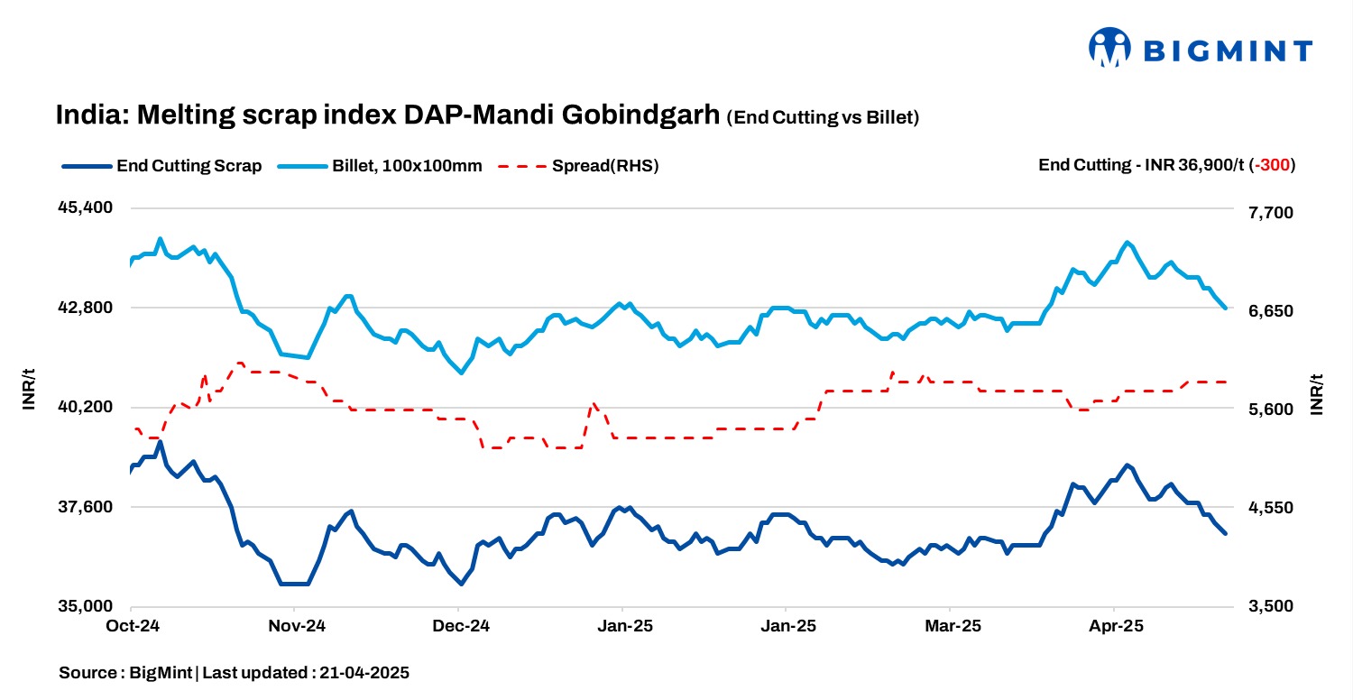 BigMint’s domestic end-cutting scrap index, tracking the Mandi Gobindgarh market, dropped by INR 300/tonne (t) d-o-d to INR 36,900/t DAP on 21 April 2025. Sources indicate that the market remains under pressure, with steel demand yet to pick up meaningfully, keeping both buyers and sellers cautious.