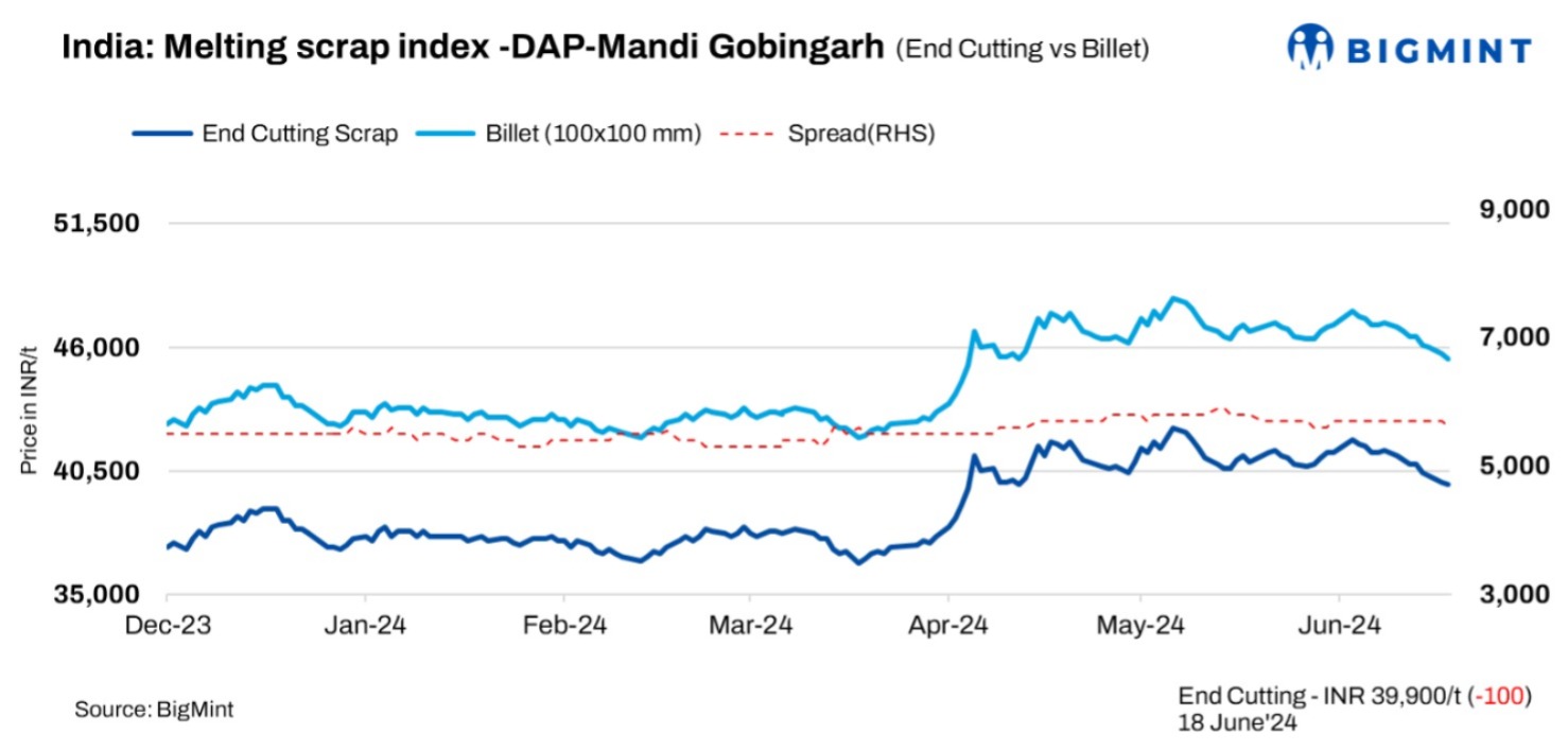 BigMint’s domestic end-cutting scrap index in the Mandi Gobindgarh market dropped by INR 100/t to INR 39,900/t DAP on 18 June, 2024. In recent days, the semi-finished and finished steel markets in the region have experienced minimal trading activity, prompting steelmakers to lower their prices. Additionally, buyers are holding off on purchases in anticipation of further price reductions.