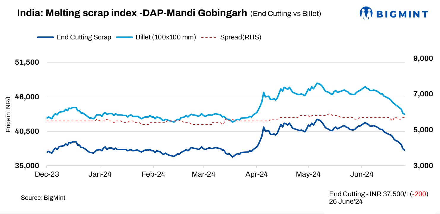BigMint’s domestic end-cutting scrap index fell by INR 200/t to INR 37,500/t DAP in the Mandi Gobindgarh market on 26 June, 2024. In the second half of today’s trading session, there was noticeable trade movement compared to recent days, with moderate buying activity seen in the market.