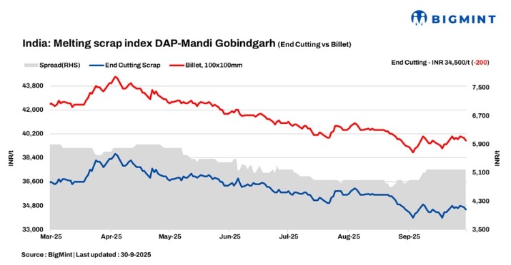 BigMint’s domestic end-cutting scrap index, tracking the Mandi Gobindgarh market, declined by INR 200/tonne (t) d-o-d to INR 34,500/t DAP on 30 September 2025. Mills limited their scrap purchases due to tepid demand in the finished steel segment. This sluggish market movement pressured scrap suppliers in Mandi to cut their offers.