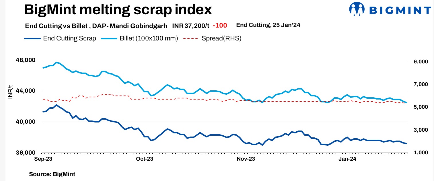 On 25 January, 2024, the index for domestic steel scrap (end-cutting) in Mandi Gobindgarh, as reported by BigMint, recorded a decrease of INR 100/tonne (t), settling at INR 37,200/t on a delivered-at-plant (DAP) basis.
