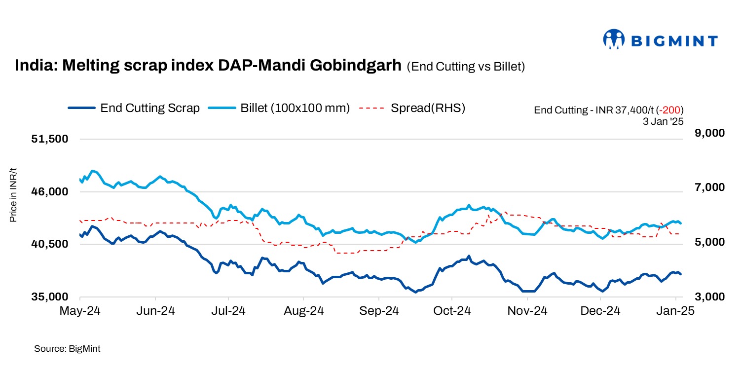 BigMint’s domestic end-cutting scrap index, tracking the Mandi Gobindgarh market, decreased by INR 200/tonne (t) d-o-d to INR 37,400/t DAP on 3 January, 2025.