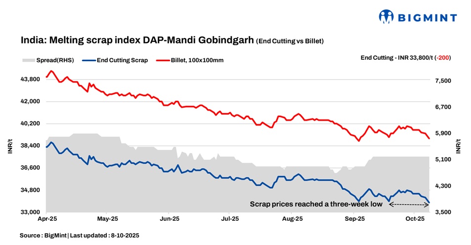BigMint’s domestic end-cutting scrap index, tracking the Mandi Gobindgarh market, declined by INR 200/t d-o-d to INR 33,800/t DAP on 8 October 2025. Scrap prices reached a three-week low, last seen on 18 September 2025.