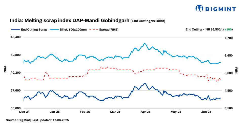 BigMint’s domestic end-cutting scrap index, tracking the Mandi Gobindgarh market, increased by INR 100/tonne (t) d-o-d to INR 36,500/t DAP on 17 June 2025.