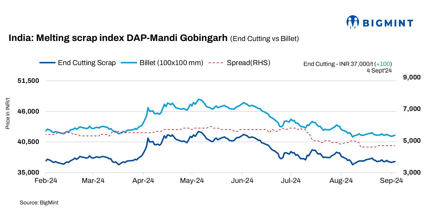 BigMint’s domestic end-cutting scrap index tracking the Mandi Gobindgarh market rose by INR 100/t to INR 37,000/t DAP on 4 September. Today, the Mandi steel market experienced moderate activity, as steelmakers anticipate steady buying trends for the rest of the week. Additionally, imported scrap buyers hold back offers due to discrepancies in bid-offers and are currently focusing on domestic scrap.