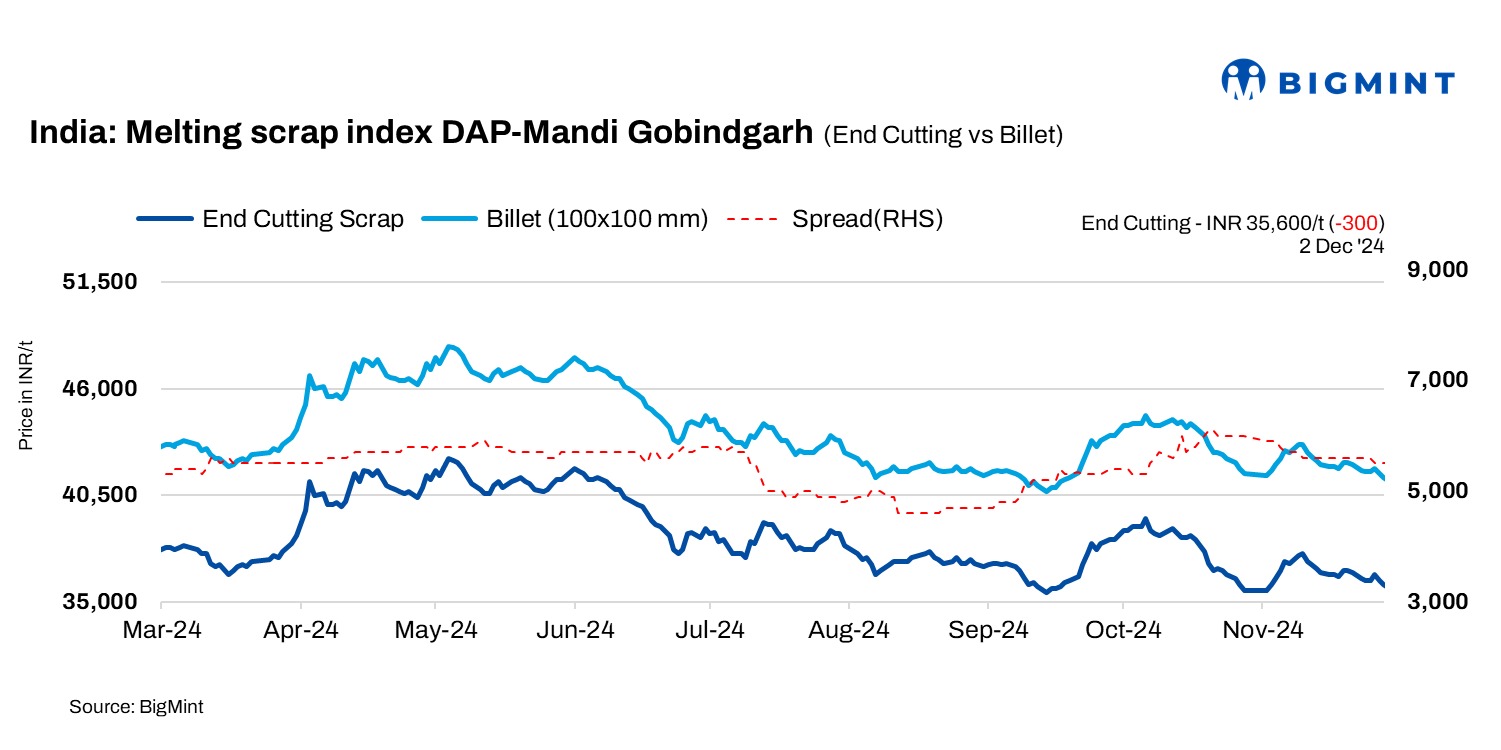 BigMint’s domestic end-cutting scrap index, tracking the Mandi Gobindgarh market, decreased by INR 300/tonne (t) d-o-d to INR 35,600/t DAP on 2 December 2024.