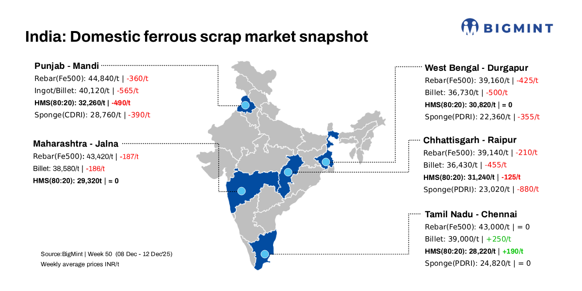 BigMint’s domestic end-cutting scrap index, tracking the Mandi Gobindgarh market, declined by INR 200/tonne (t) d-o-d to INR 35,100/t DAP on 12 December 2025.However, the index decreased by INR 400/t w-o-w as steel prices continued to edge down.
