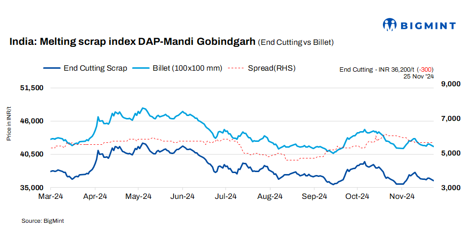 BigMint’s domestic end-cutting scrap index, tracking the Mandi Gobindgarh market, edged down by INR 300/tonne (t) d-o-d to INR 36,200/t DAP on 25 November 2024. The Mandi steel market was subdued, amid reduced demand from neighbouring states for finished products and ongoing liquidity challenges. Scrap procurement by mills was limited, as buyers lay low, in expectation of further price drops given the sluggish semi-finished and finished steel markets.