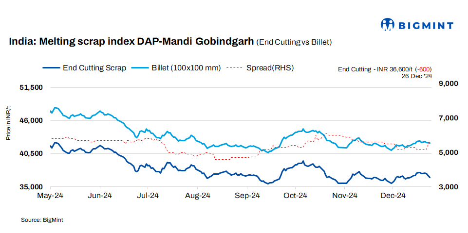 BigMint’s domestic end-cutting scrap index, tracking the Mandi Gobindgarh market, dropped by INR 600/tonne (t) in the last two days to INR 36,600/t DAP on 26 December 2024. Compared to the last 8-10 days, this market drop is due to plant owners, especially patra mills, showing less interest in buying scrap, as their plants are running at only 50% capacity. As a result, the demand for scrap has also decreased.