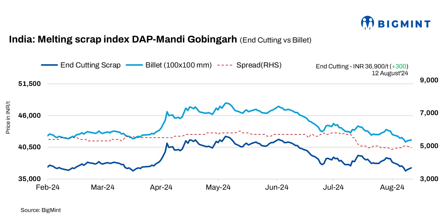 End-cutting billets spread: In Mandi, the end-cutting scrap and billet spread was at INR 4,800-5,000/t.