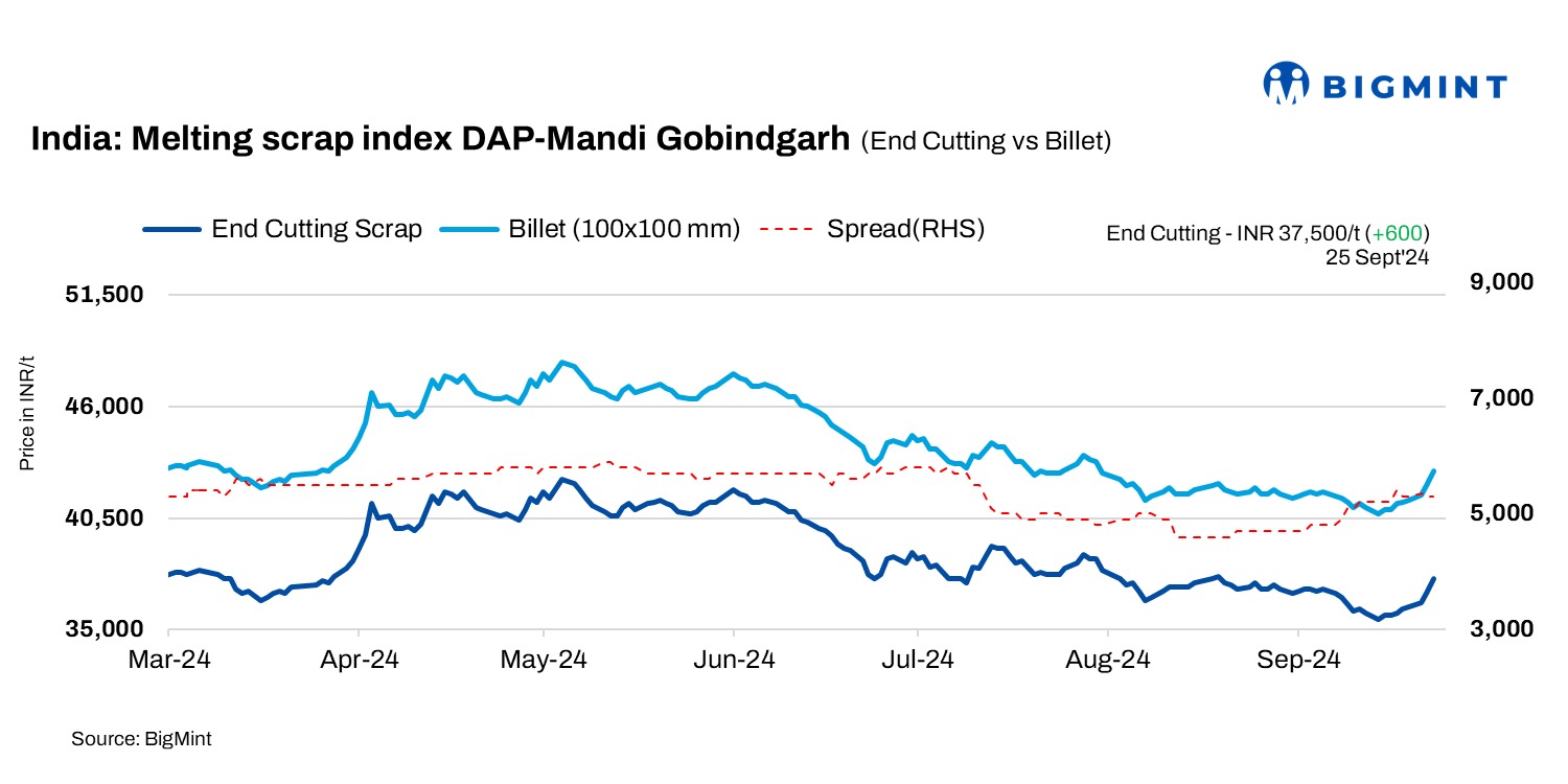 BigMint’s domestic end-cutting scrap index, tracking the Mandi Gobindgarh market, witnessed a continuous rise, increasing by INR 600/t to INR 37,500/t DAP.