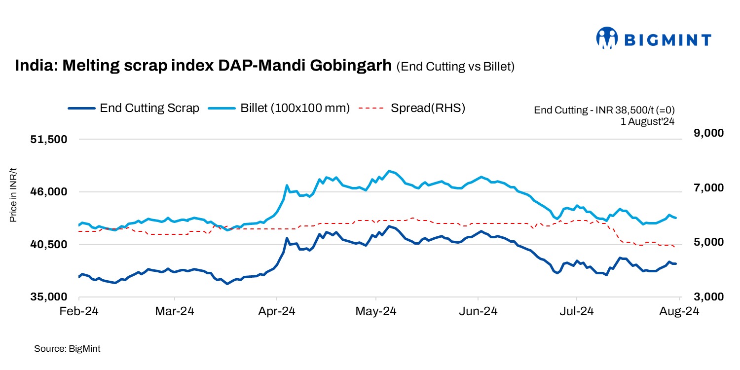 BigMint’s domestic end-cutting scrap index tracking the Mandi Gobindgarh market remained stable at INR 38,500/t DAP on 1 August, 2024.