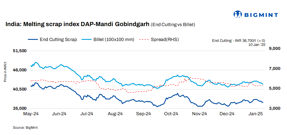 BigMint’s domestic end-cutting scrap index, tracking the Mandi Gobindgarh market, remained stable d-o-d at INR 36,700/t DAP on 10 January, 2025.