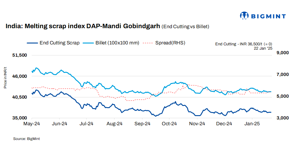 BigMint’s domestic end-cutting scrap index, tracking the Mandi Gobindgarh market, remained stable d-o-d at INR 36,500/t DAP on 22 January, 2025.