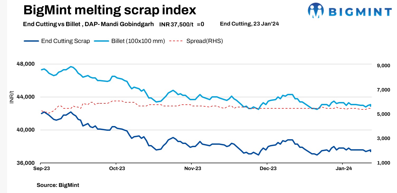 On 23 January, 2024, BigMint’s domestic steel scrap (end-cutting) index remained unchanged d-o-d, reaching INR 37,500/t on a delivered-at-plant (DAP) basis in Mandi Gobindgarh.