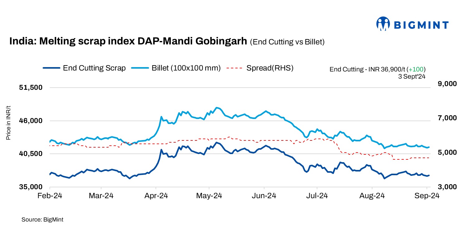 BigMint’s domestic end-cutting scrap index for the Mandi Gobindgarh market increased slightly by INR 100/tonne (t) d-o-d to INR 36,900/t DAP on 3 September 2024.
