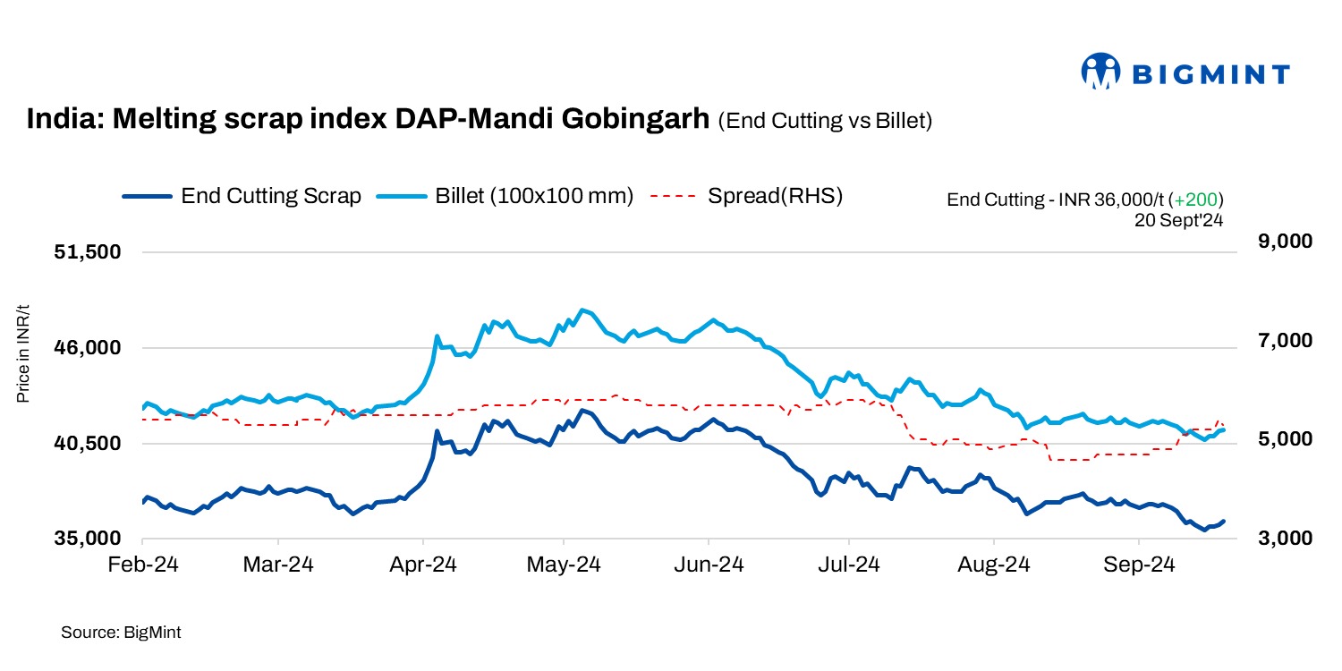 End-cutting-billets spread: In Mandi, the end-cutting scrap and billet spread was at INR 5,300/t.