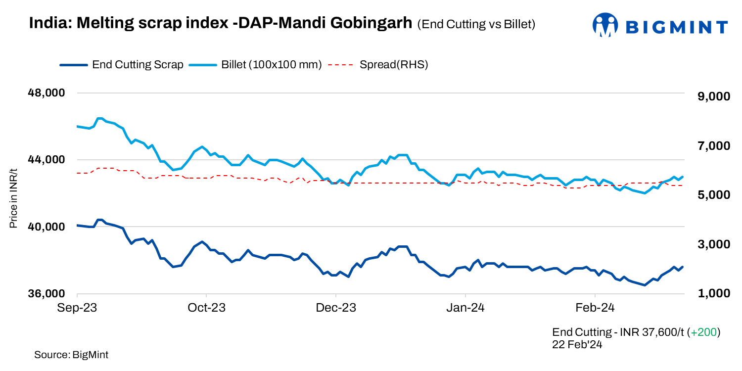 The domestic steel scrap index (end-cutting) in Mandi Gobindgarh, as reported by BigMint on 22 Feb, 2024, recorded a rise of INR 200/t, settling at INR 37,600/t on a delivered-at-plant (DAP) basis. In this region, there was a noticeable shortage of scrap, prompting mills to procure scrap at moderate levels. The market has observed spot bookings in the first halves of trading session, which was the primary reason for the increase in semi-finished prices today.