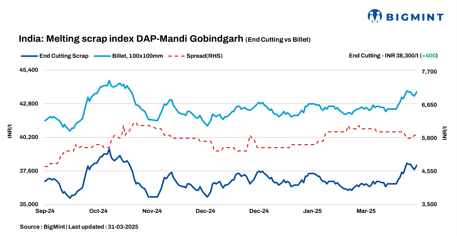 BigMint’s domestic end-cutting scrap index, tracking the Mandi Gobindgarh market, increased by INR 400/tonne (t) d-o-d to INR 38,300/t DAP on 31 March 2025. As expected, steel demand in the region was strong, leading to an increase of INR 200-500/t in semi-finished and finished steel prices in Mandi.