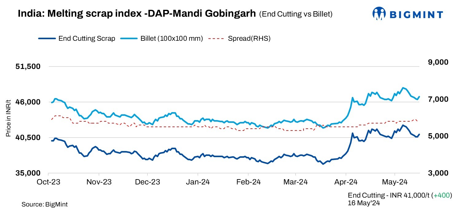 End-cutting and billets spread: In Mandi, the end-cutting scrap and billets spread was at INR 5,600-5,800/t.
