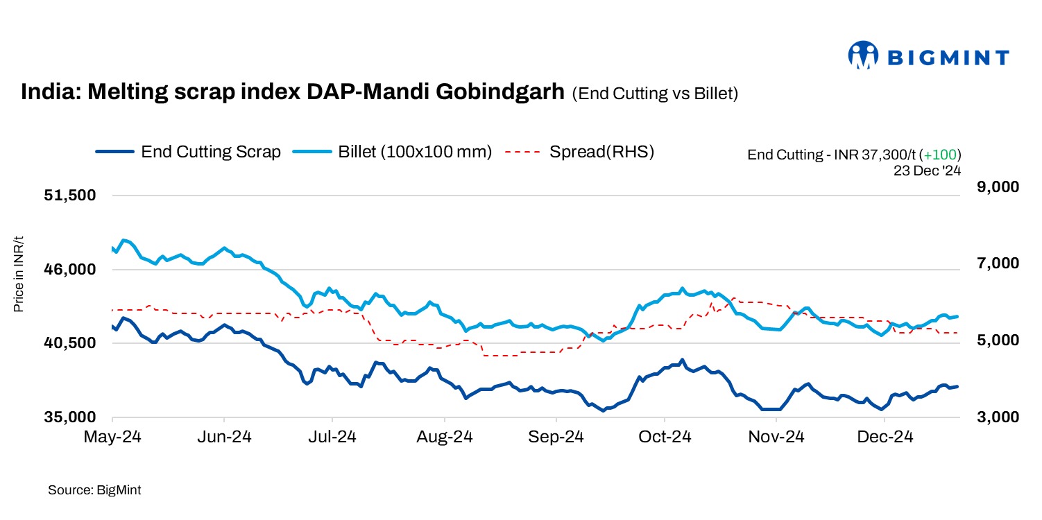 BigMint’s domestic end-cutting scrap index, tracking the Mandi Gobindgarh market, rose INR 100/tonne (t) d-o-d to INR 37,300/t DAP on 23 December 2024 amid a range-bound market.