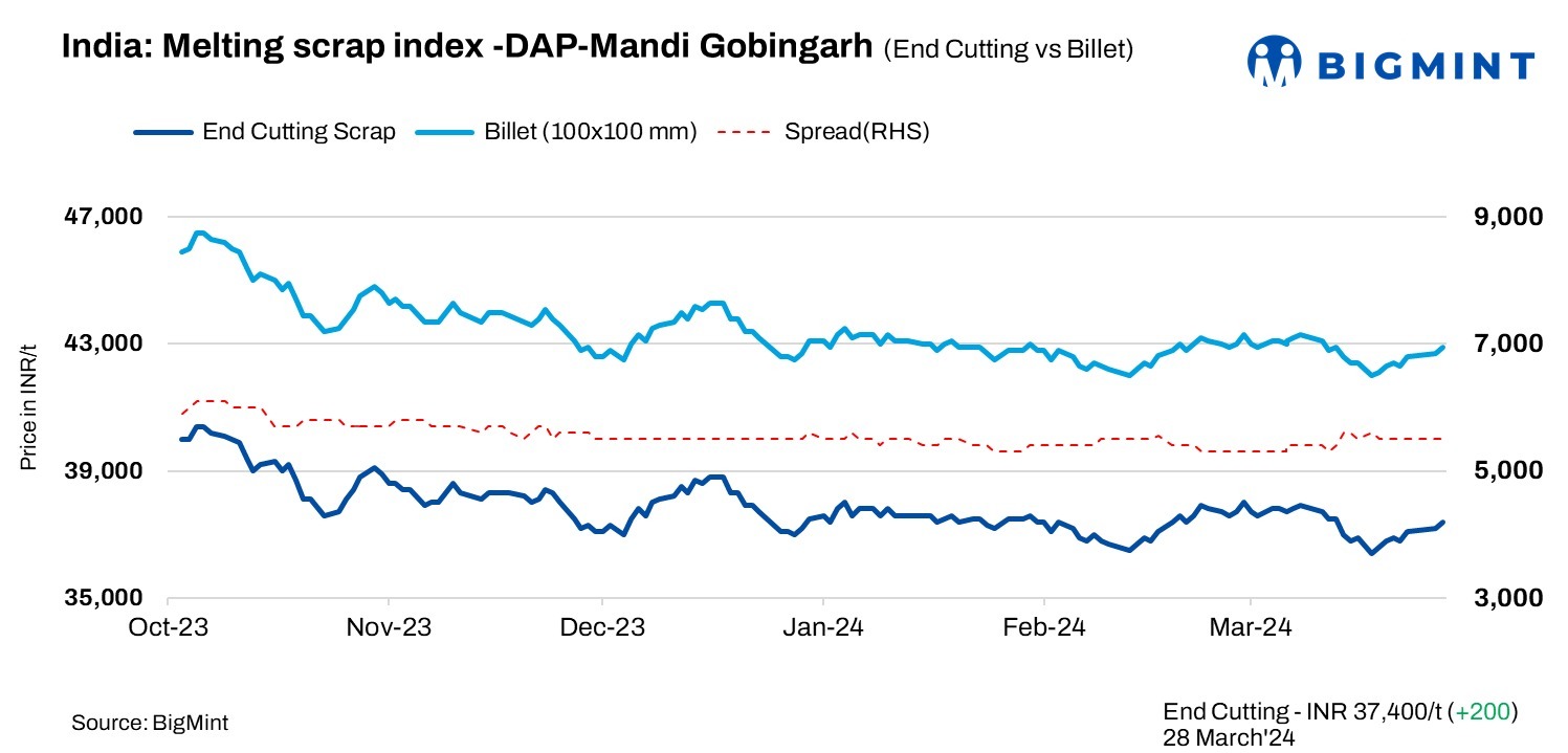 BigMint’s domestic steel scrap index (end-cutting) in Mandi Gobindgarh recorded a rise of INR 200/t, settling at INR 37,400/t on a delivered-at-plant (DAP) basis on 28 March, 2024. Moderate trading activity has been observed in the market over the past few days.