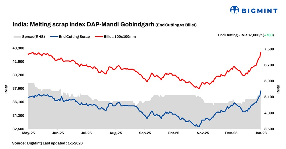 BigMint’s domestic end-cutting scrap index, tracking the Mandi Gobindgarh market, increased by INR 700/tonne (t) d-o-d to INR 37,600/t DAP on 1 Jan 2026.