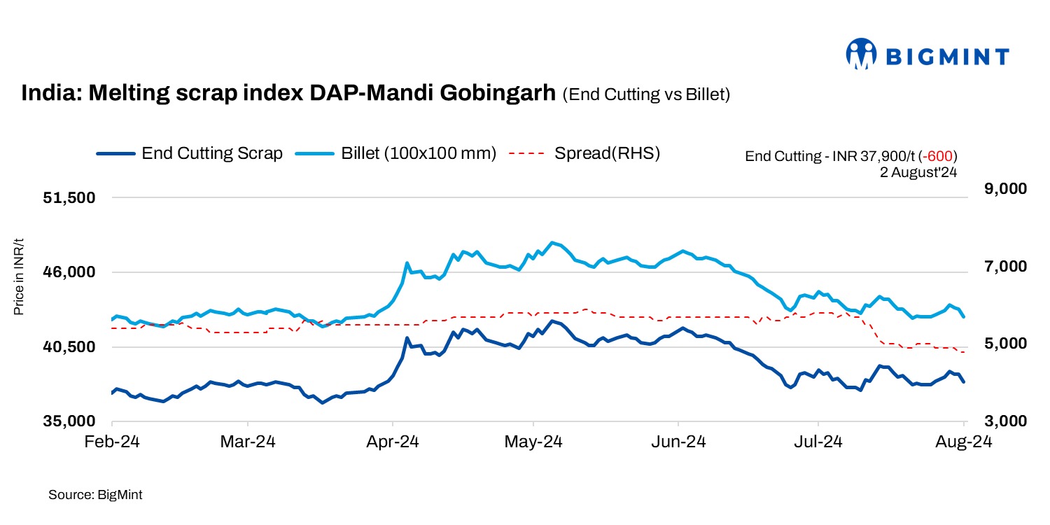 BigMint’s domestic end-cutting scrap index tracking the Mandi Gobindgarh market fell by INR 600/t to INR 37900/t DAP on 2 August, 2024.