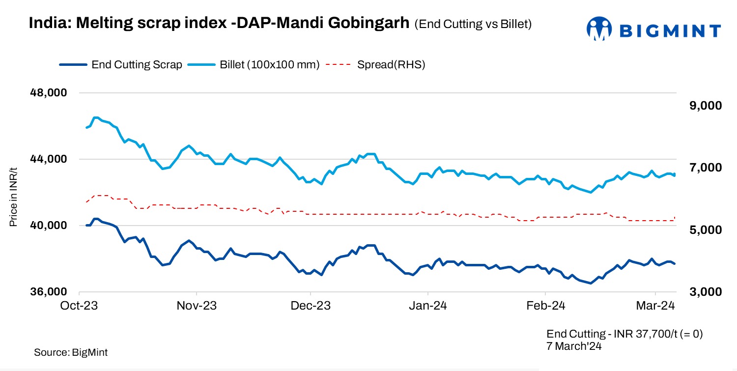 BigMint’s domestic scrap (end-cutting) index remained steady at INR 37,700/t DAP Mandi Gobindgarh on 7 March, 2024. The scrap procurement activity was affected by a disparity between buyers and sellers, resulting in only a few mills in need purchasing scrap at suppliers price.