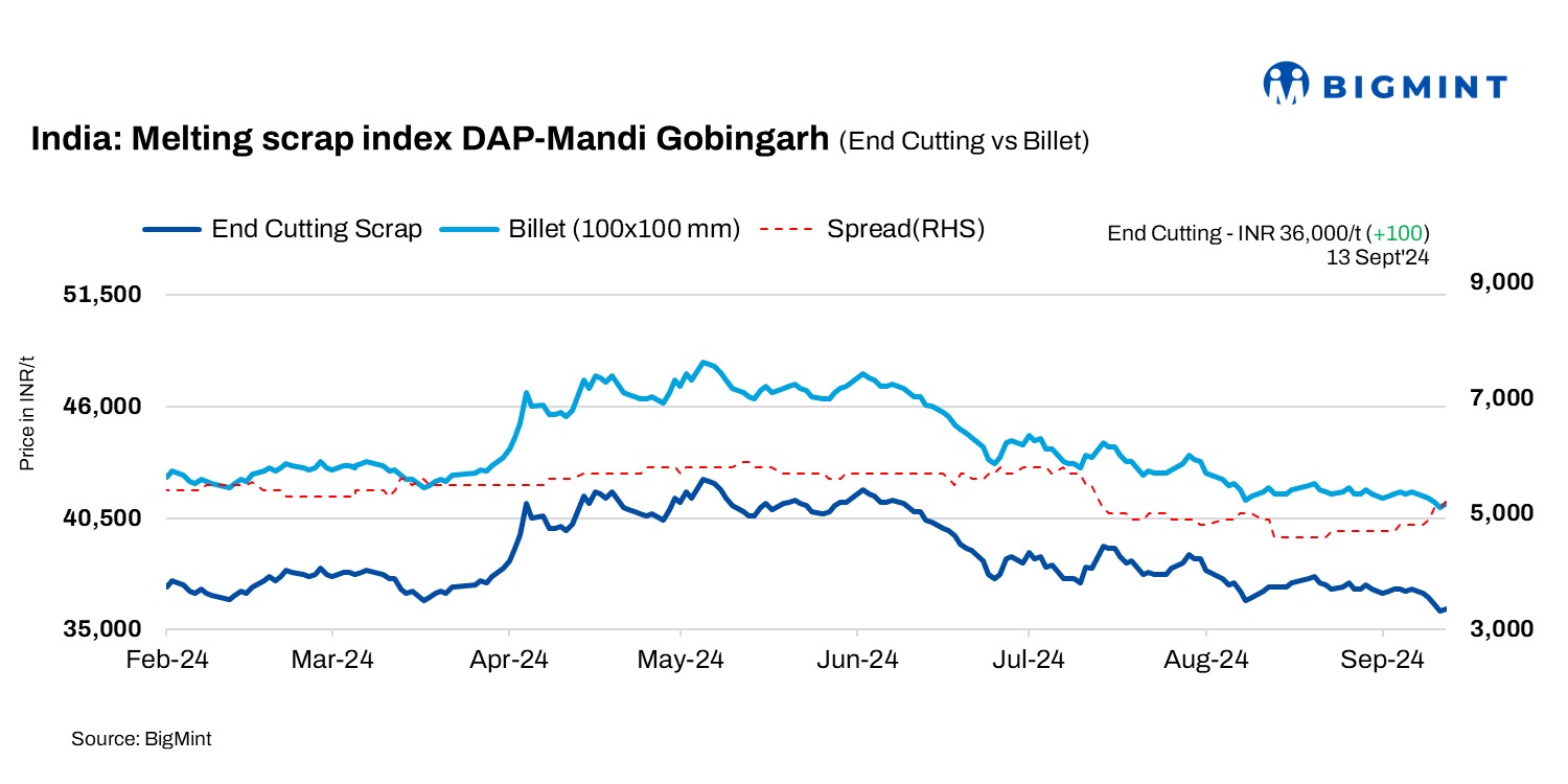 BigMint’s domestic end-cutting scrap index tracking the Mandi Gobindgarh market rose by INR 100/t to INR 36,000/t DAP today.