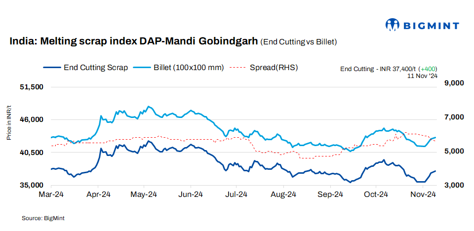 BigMint’s domestic end-cutting scrap index, tracking the Mandi Gobindgarh market, climbed INR 400/t d-o-d to INR 37,400/t ($443/t) DAP on 11 November 2024. Today, the Mandi scrap market experienced decent trading activity, with the major mills actively procuring scrap in substantial volumes as demand surged, prompting suppliers to maintain higher offer levels.