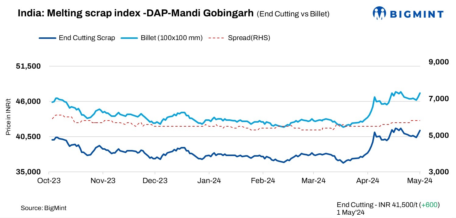 BigMint’s domestic end-cutting scrap index in the Mandi Gobindgarh market rose by INR 600/tonne (t) to INR 41,500/t DAP on 1 May, 2024. As prices improved suddenly, major scrap suppliers increased their offers, while some suppliers have chosen to hold onto their material. However, mills continue to struggle to procure scrap at fair prices.