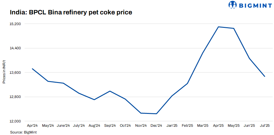 BPCL has revised pet coke prices for Jul’25 across its refineries. At Bina, rail supply rates fell by INR 598/t m-o-m to INR 13,522/t, with road ones being INR 50/t lower. Kochi saw a modest rise of INR 228/t to INR 11,145/t. Bina’s supply stays limited at 20-25,000 t/month due to captive use, while Kochi’s availability remains steady around 85-90,000 t/month.