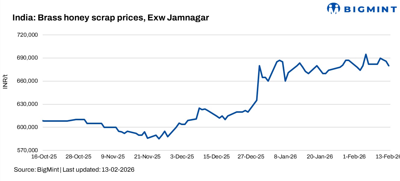 Domestic brass honey scrap prices moved lower w-o-w. BigMint assessed brass honey, exw Jamnagar, Gujarat, at INR 680,000/tonne (t) on 13 February, down INR 15,000/t from INR 695,000/t a week ago.Market participants indicated that brass honey scrap prices edged higher during the first week of February, assessed at INR 695-900/kg ex-Jamnagar, as new trades actively took place after the slowdown in January due to the start of the new year. Moreover, record-high London Metal Exchange (LME) prices urged market participants to sell material immediately.