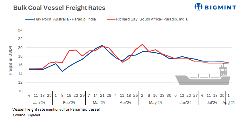 - South Africa-India freights drop w-o-w: Freight rates from the Richards Bay Coal Terminal (RBCT) to Paradip are currently at around $16.2/dmt, down by $0.22/t/t w-o-w. Amid the monsoon season in India coal demand has decreased across regions primarily due to reduced consumption. Industrial demand has also slowed, as infrastructural projects are on hold due to the rains, resulting in limited coal imports.