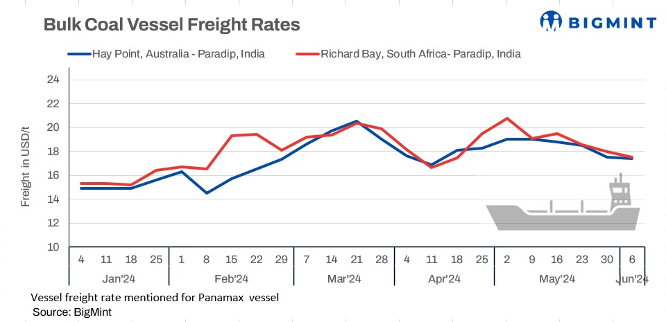 - Australia-India freight rates remain stable w-o-w: Freight rates from Australian ports fell w-o-w for India. As per BigMint’s assessment, coal freight rates from Port Hay Point to Paradip were recorded at $17.5/tonne (t), largely stable. An Indian mill was heard to have fixed a 75,000 t cargo from Abbot Point to Vizag at $18.65/t for laycan 25 June-4 July’24. Australian coking coal prices have recovered by around $8/t today due to a scarcity of coal for July loading, with miners concentrating on increasing production in the final month of their financial year, resulting in lower availability in July due to maintenance activities.