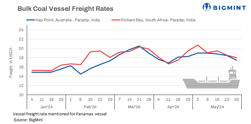Coal vessel freight rates have shown a downtrend this week. The drop in coal stocks can be attributed to the restocking process coming to an end ahead of the monsoons expected to arrive by the first week of June 2024. This is likely to affect imports, and the end of summer signals reduced power demand, further influencing coal stock levels.