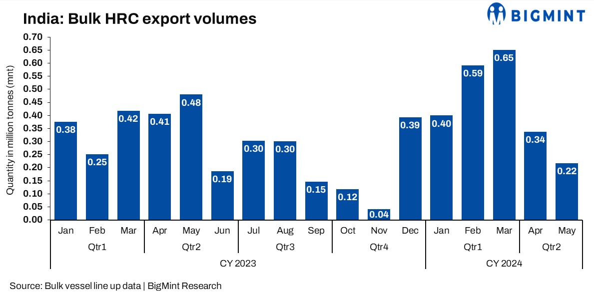 Indian exports of hot-rolled coil (HRC) steel witnessed a significant drop in May 2024, according to bulk vessel line-up data compiled by BigMint (excluding container and road transport). HRC exports fell by a substantial 35%, reaching a total of only 217,876 tonnes (t) against 3,37,744 t in April 2024. This represents the lowest monthly export volume in six months, after reaching at 40,500 t levels in November 2023. Moreover, the same decreased sharply by 55% y-o-y against 480,365 t in May 2023.