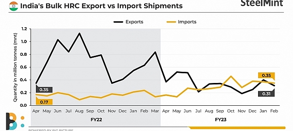 India’s bulk HRC exports touched 3.72 million tonnes (mnt) over April 2022-February 2023, as per data maintained with SteelMint, dropping 50% against 7.50 mnt recorded over April 2021-February 2022.