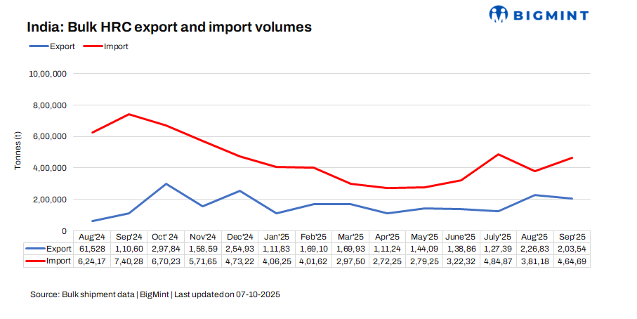 On the export front, India’s bulk HRC export volumes rose by 11% y-o-y in H1FY’26 to 964,183 t compared to 865,748 t in H1FY’25.