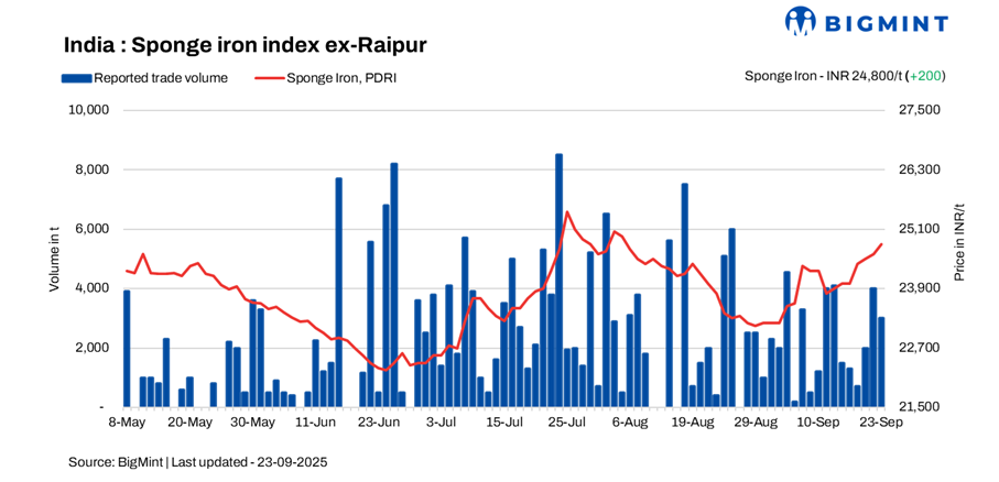 India’s sponge iron market saw an upward movement on 23 September, with prices rising by INR 100-300/t d-o-d. Hyderabad led the rally with the steepest gain of INR 300/t, supported by stronger regional sentiment. In contrast, Durgapur saw prices slipping by INR 50/t, reflecting localized supply-demand imbalances.