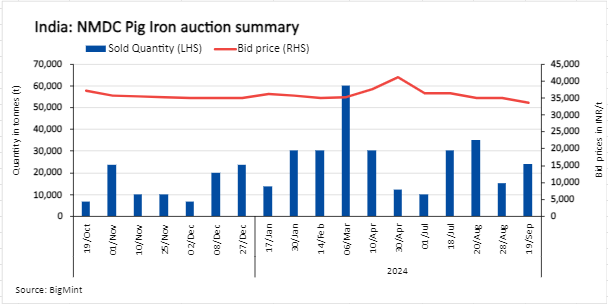 NMDC’s steel plant in Nagarnar, Chhattisgarh, conducted a steel-grade pig iron auction for 32,000 t on 19 Sep’24. Out of the total quantity, 24,000 t were booked at an average price of INR 33,500/t. However, management approval is pending. In the previous approved auction, held on 28 Aug’24, the entire quantity was booked at an average price of INR 35,000/t.