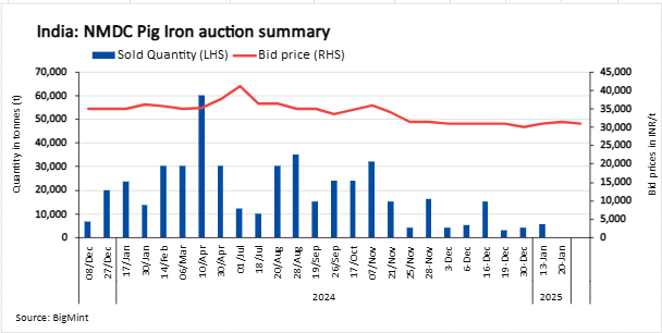 NMDC’s steel plant in Nagarnar, Chhattisgarh, conducted an auction for 10,000 t of steel-grade pig iron on 20 Jan’25. Out of the total quantity on offer, 7,000 t were booked at a base price of INR 31,000/t. In the previous auction, held on 13 Jan’25, 1,000 t were booked at an average price of INR 31,500/t.