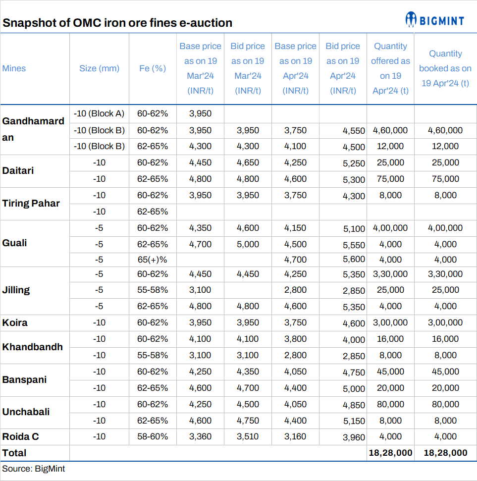 OMC conducted an auction for 1.828 mnt of iron ore fines (Fe 54-65%) on 19 Apr’24. Entire quantities of fines were booked at INR 2,850-5,600/t. Bids for fines have increased by INR 300-900/t for majority lots against last month’s bids, as per BigMint’s analysis. An increase in pellets price along with decent hike in sponge and finished steel price had boosted steelmakers confidence for aggressive bids.