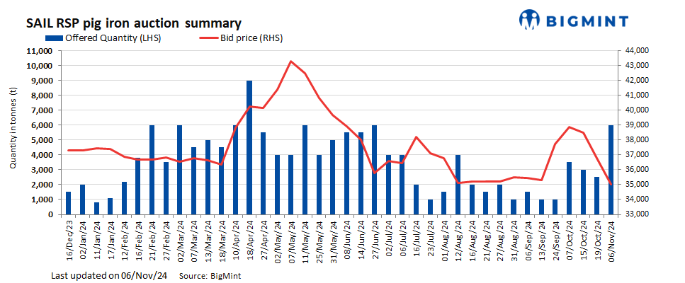 SAIL-Rourkela Steel Plant (RSP) held an auction on 6 Nov’24 for 6,000 t of steel-grade pig iron. The entire volume on offer was booked at an average price of INR 35,000/t exw. Previously, on 19 Oct, RSP auctioned 3,000 t of steel-grade pig iron, with the entire quantity sold at an average price of INR 36,800/t exw.