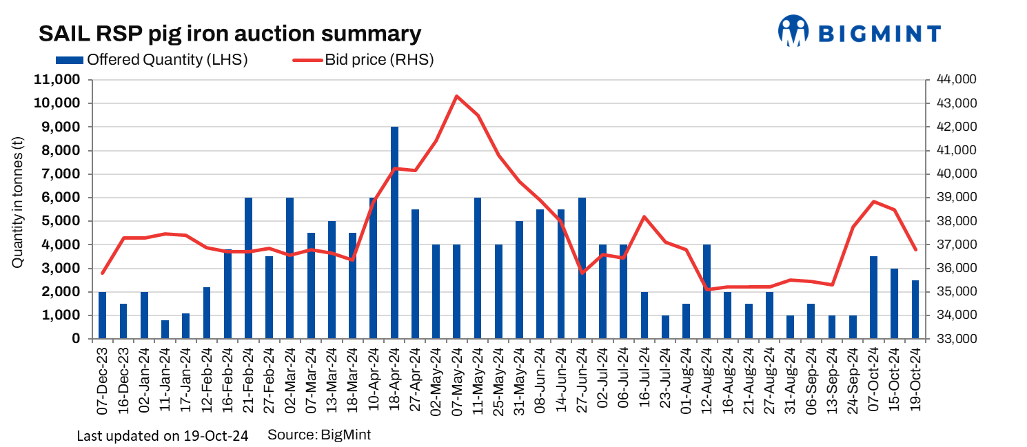 SAIL-Rourkela Steel Plant (RSP) conducted an auction on 19 Oct’24 for 3,000 t of steel-grade pig iron, in which the entire volume was sold at an average price of INR 36,800/t exw. Earlier, on 15 Oct, RSP auctioned 3,000 t of steel-grade pig iron, in which only 700 t were booked at an average price of INR 38,500/t exw.